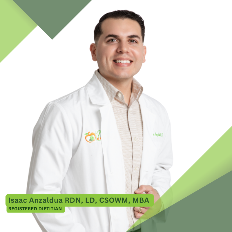 Isaac Anzaldua RDN, CSOWM, MBA is a dietitian from La Grulla, TX, who is passionate about helping men and women improve their diets, health, and self-esteem. Isaac has worked with various healthcare settings, including a local clinic, weight loss clinics, hospitals, and dialysis center, assisting thousands of patients with weight management and other health concerns.He holds a Bachelor's Degree in Dietetics from the University of Texas—Rio Grande Valley (UTRGV), Certification in Obesity and Weight Management credential, and a Master's Degree in Business Administration from UTRGV. Isaac acknowledges the support and influence of his parents, teachers, coaches, professors, and the Holy Spirit in achieving his educational and career goals.